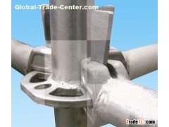 Wide opening in rosette allows alignment of ledgers and diagonal braces at the required angle